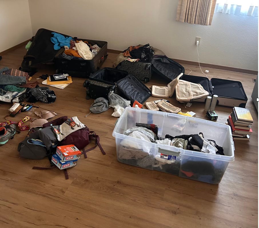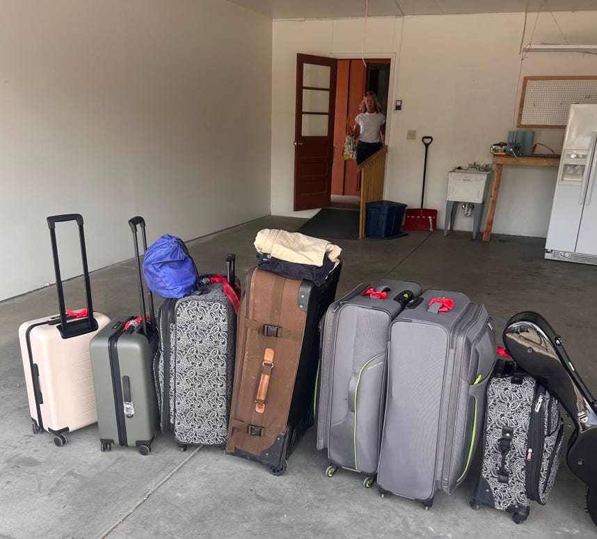 Monday the last loads of books were donated to the library and a few more loads went to the Goodwill. The final squishing of items into suitcases was underway! We hauled six very heavy suitcases to the Holiday Inn Express and caught a ride back to our house to sell our beds. By 6:30 pm all our possessions fit into just six suitcases!